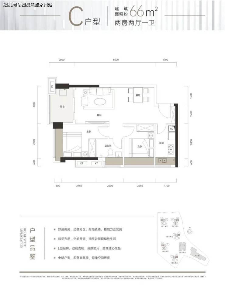 项目主力户型有66㎡的2房1卫,设计的竖厅格局,客厅3米开间,有东西2个朝向;