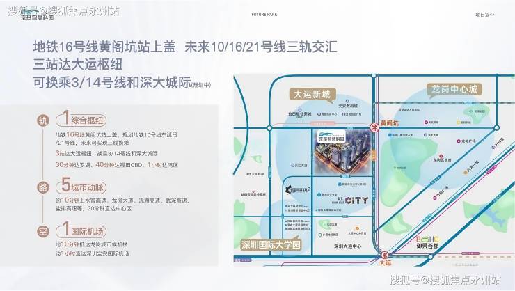 项目为地铁16号线黄阁坑站上盖物业,未来将实现10/16/21号线三线换乘,3站直达大运枢纽,可快速接驳3/14号线及深大城际,30分钟覆盖罗湖、福田CBD,1 小时通达大湾区主要城市。