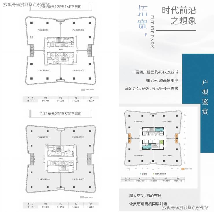 空间参数:4栋33层超高层研发办公,层高4.2米,使用率达75%,9梯4户高效配置,单户面积461-508㎡,整栋可售面积1922㎡,满足企业总部、中试实验、研发中心等多元需求。