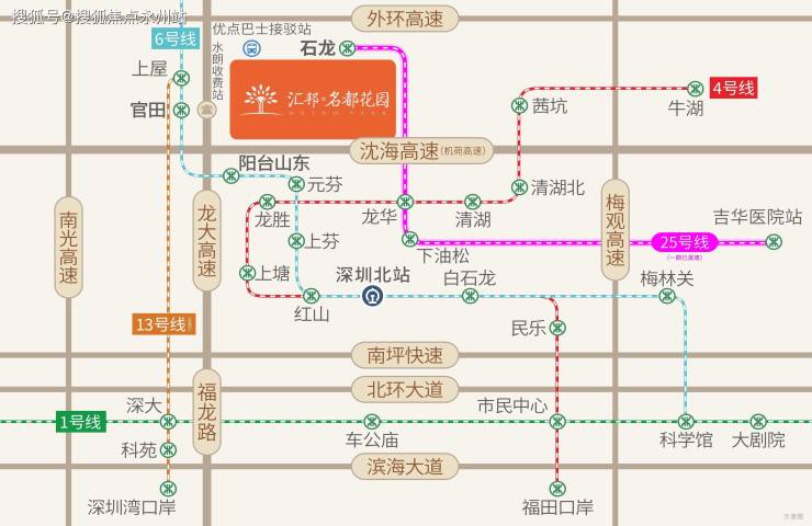 汇邦名都花园项目备案名为汇裕名都,地址位于深圳宝安石岩街道龙大高速与横当岭一路交汇处东侧,是石岩区域继宏发世纪城后第二个大型综合体项目。