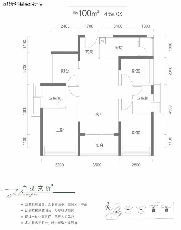 100平3+1房2卫:阳台一样可以改成次卧,做到4房,双阳台设计,南朝向,使用率也在78-79%左右,4房2卫,传统的竖厅户型,动静分区格局,传说中的‘双龙抱珠’户型,双阳台设计;这种户型设计很合理,卧室在客厅的两边,卫生间的布局也很科学,减少了过道,空间利用率特别高。主卧不包括卫生间大小为11.5平米,比较适中,不过朝东的卧室只有4平米左右,做成卧室稍小,比较适合做成书房或者储藏室;这个户型的厨房利用空间大很多,还带有一个生活阳台。
