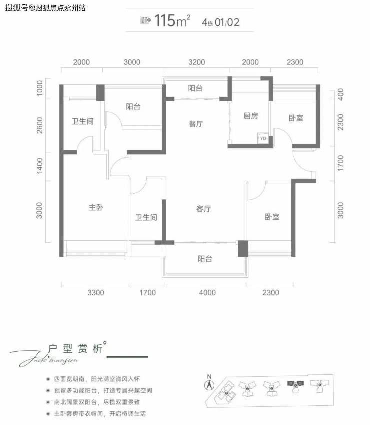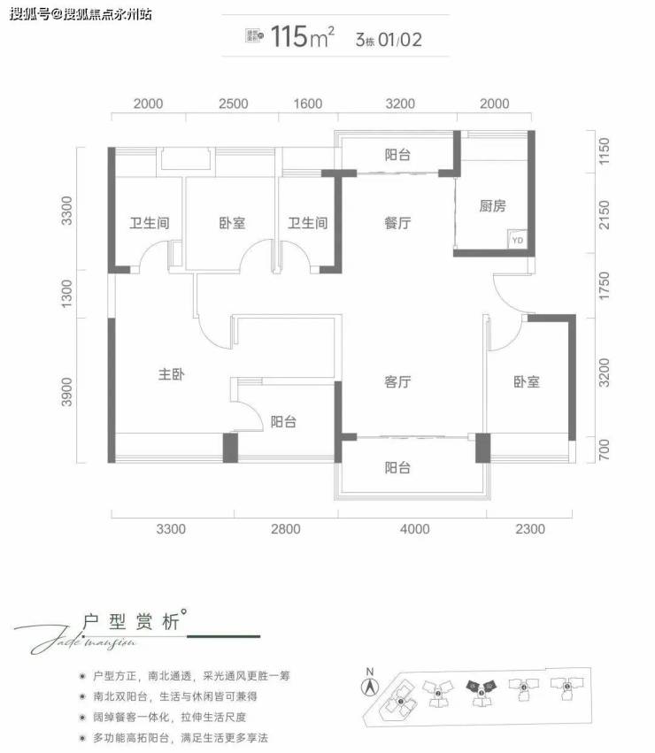 115平3+1房2卫:这个面积段是套数最多的,有四条腿、有两个户型。3栋两条腿对称,一个东南、一个西南朝向;4栋两条腿都是南北通透。这两个户型设计和布局都还不错,