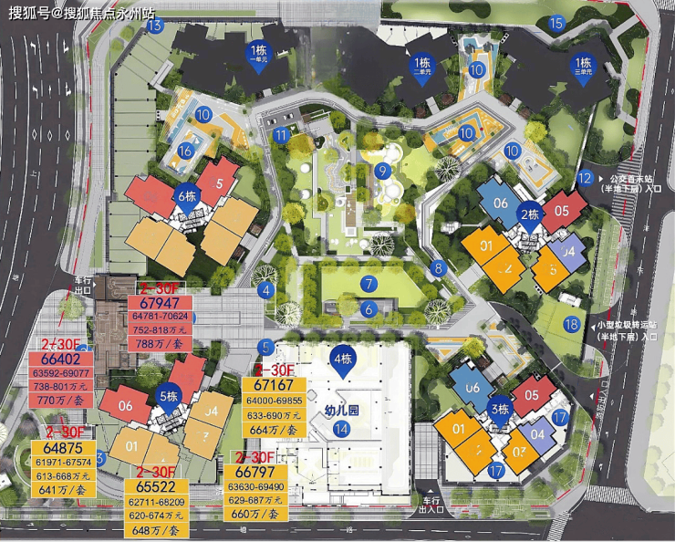 项目由7栋住宅楼组成,楼高在30-46层之间,具体包括: