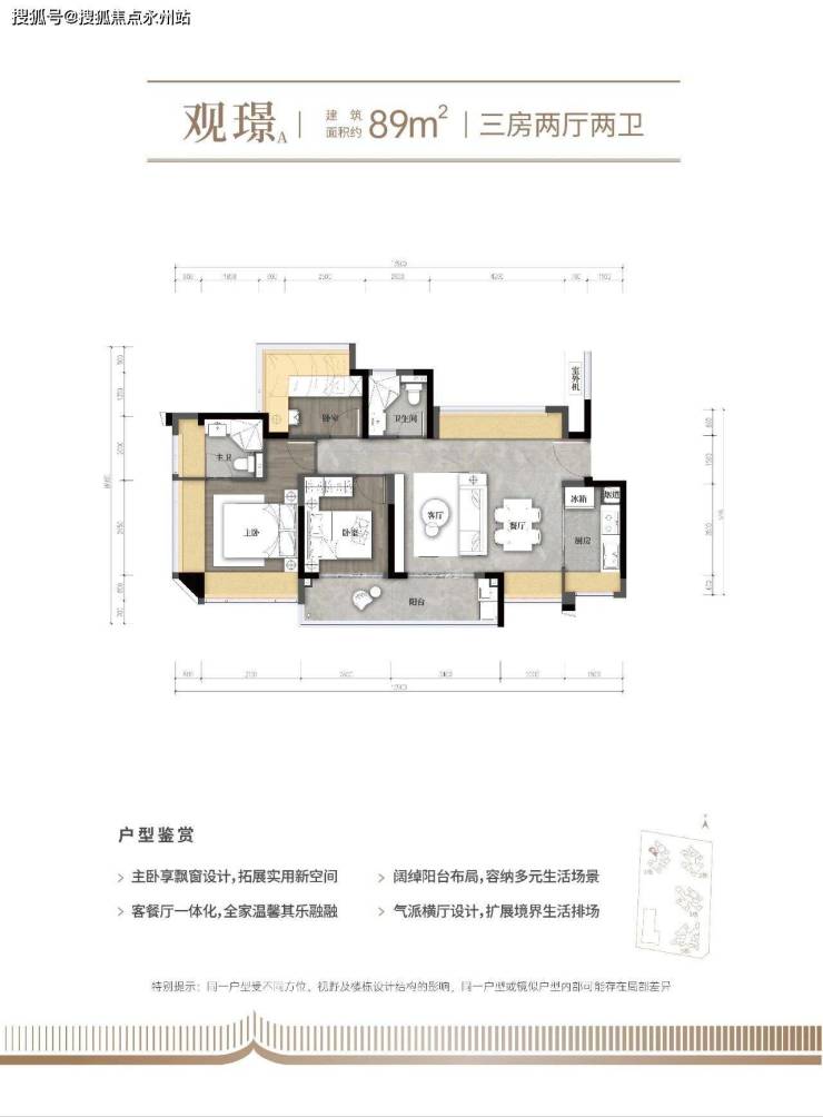 尺度突破:89㎡横厅户型的场景化创新,此次加推的89㎡横厅三房是项目的明星产品,代表了新规下户型设计的新思路。与传统竖厅相比,该户型采用5.4米的超大开间设计,配合6.2米长的南向景观阳台,形成了极具冲击力的空间感受,彻底改变了人们对百平米以下户型的固有认知。这种设计不仅提升了空间利用率,更重构了家庭生活的互动场景。
