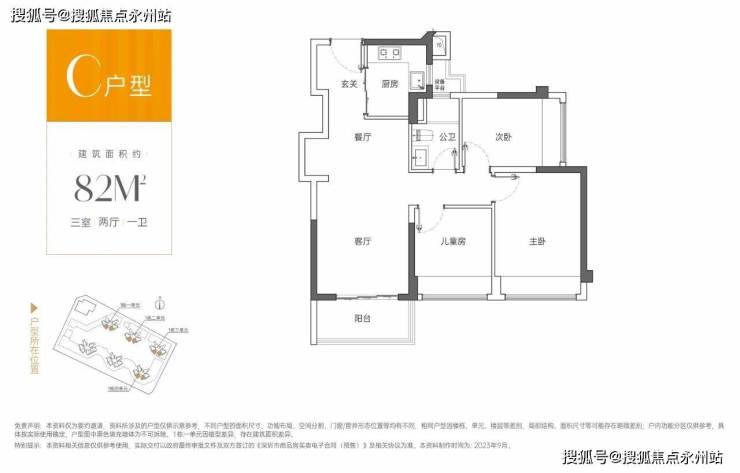 82㎡的3房2厅1卫,设计的是竖厅格局,客厅3.3米开间,S墙体设计预留双开门冰箱位,动静分区,三开间朝南,3个卧室分别做到了主卧11.4㎡/次卧7.65㎡/次卧7.49㎡(实测面积,去掉墙体),得房率:79.77%(不含赠送),L型厨房,阳台进深1.5米,西南或东南朝向。