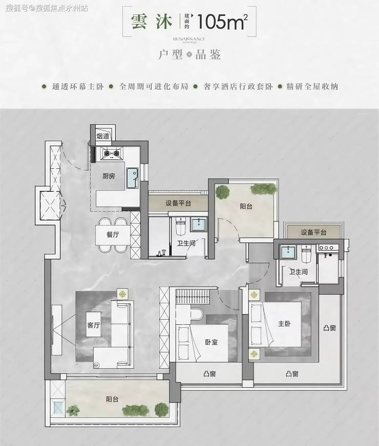 「105-143㎡的4房2厅2卫」新规下超高使用率,80cm飘窗、阳台“偷面积”设计,105平3+x户型,“全周期可进化”
