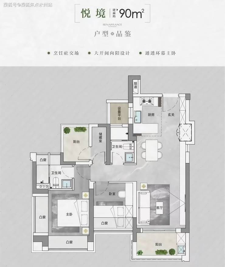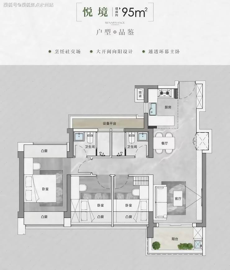 「90-95㎡的3房2厅2卫」低总价、95平超大设备平台收纳空间,通透户型、采光面极佳、大开间向阳设计,实际得房面积约为87-91平)
