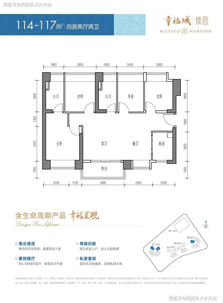 114-117㎡四房两厅两卫(横厅设计)得房率约84.87%-87.1%(含赠送)