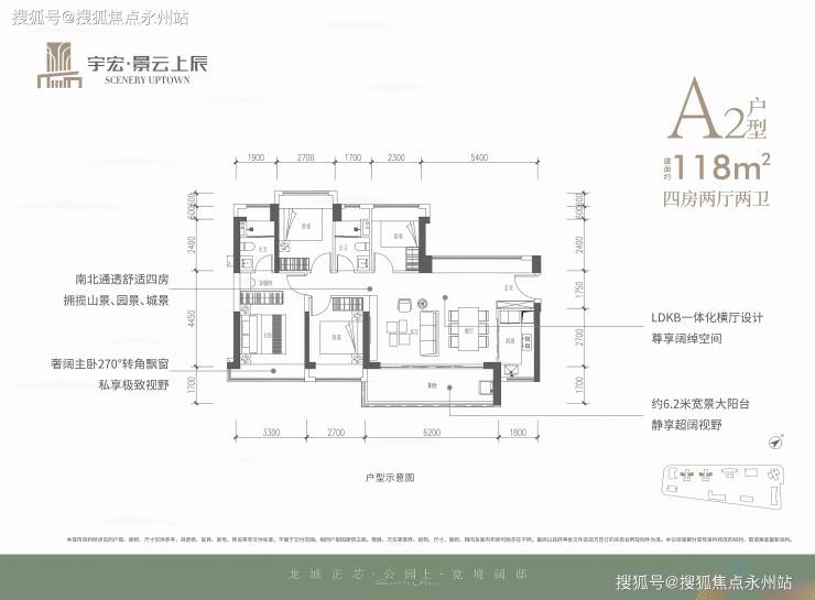 118㎡的4房2厅2卫,设计的是横厅南北通透格局,客餐厅6.2米开间,LDKB一体化,五开间朝南,西北面5.4米长的观景大飘窗,4个卧室分别做到了主卧16.66㎡/次卧9.72㎡/次卧9.18㎡/次卧6.9㎡(包含墙体飘窗),客厅连接餐厅位出6.2米长的大阳台,L型厨房,卫生间干湿分离,得房率约76%(不含赠送),东南朝向。
