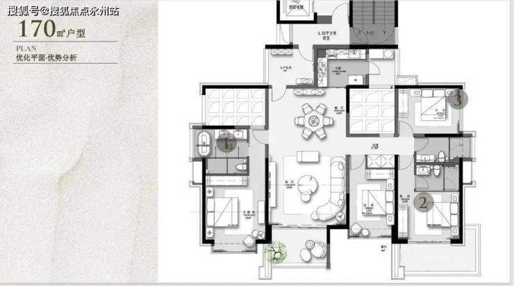 建面约170㎡,原始结构是四房两厅三卫四阳台,奇数层客厅、主卧、厨房都有阳台,偶数层是主卧、次卧、厨房有阳台。奇数偶数层入户门的阳台可做玄关使用,餐厅左侧镂空处搭起来可做卧室,餐厅右侧搭起来可做书房或儿童房使用,最多可做5+1房使用,可塑性非常强