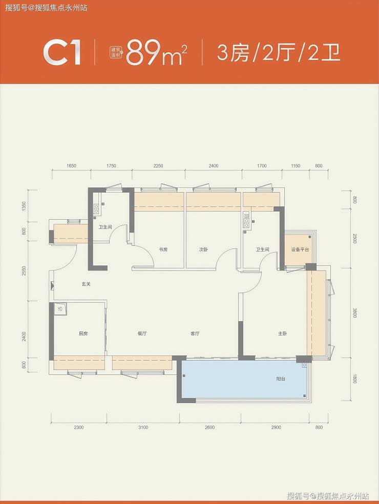 89㎡三房两卫:折后总价272-289万,单价3.05-3.25万/㎡,得房率约101%。
