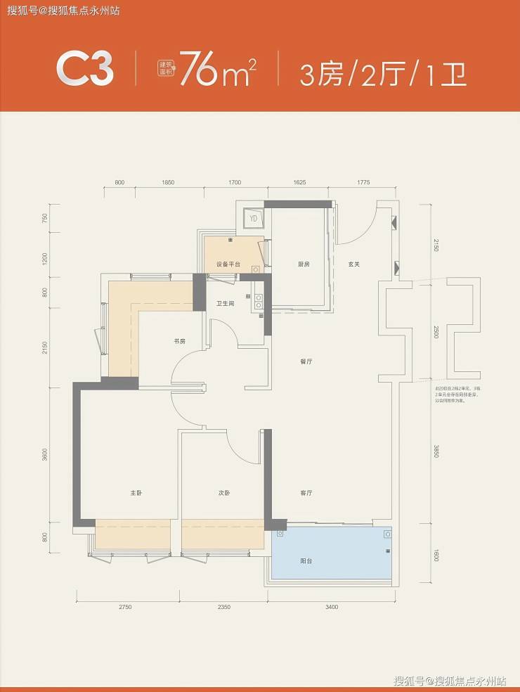 76㎡三房:实得面积约74㎡(含12.71㎡赠送),传统户型需85㎡才能实现同等空间。