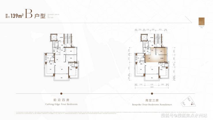 约139㎡户型:分为A/B两款,均支持三房与四房的自由切换。A户型为竖厅南北通透