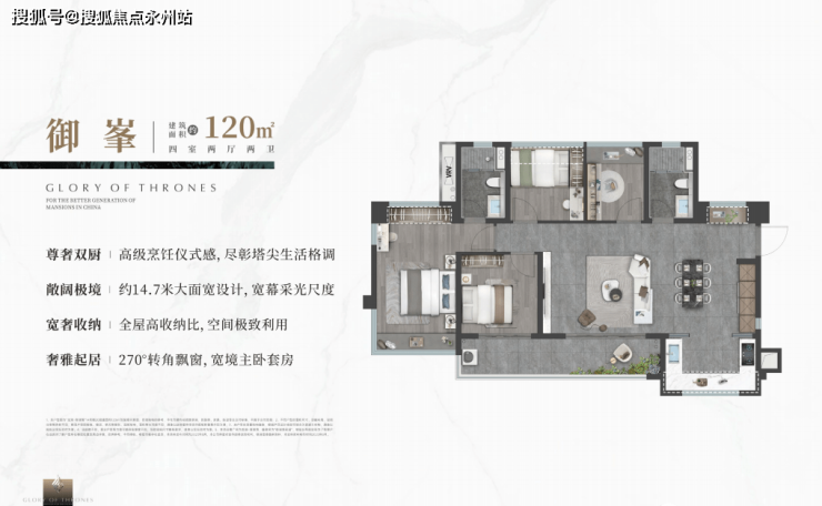 御峯:建面约120㎡,四室两厅2卫,270°转角飘窗,宽境主卧套房