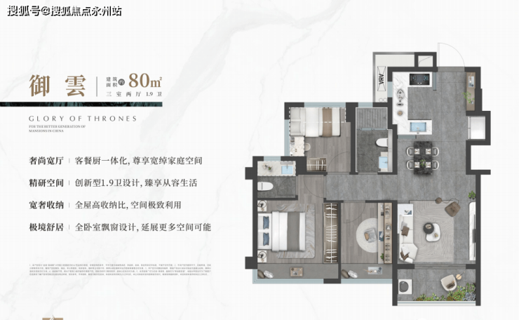 御雲:建面约80㎡,三室两厅1.9卫,创新型1.9卫设计,臻享从容生活