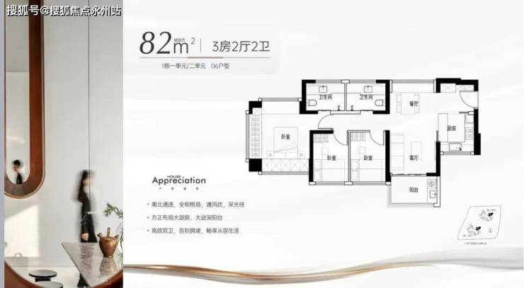 82㎡的3房2厅2卫06户型:设计的是竖厅南北通透格局,进门独立玄关,LDKB一体化,主卧270°飘窗设计,U型厨房,卫生间干湿分离,得房率约97%(包含赠送),阳台主朝西北向。