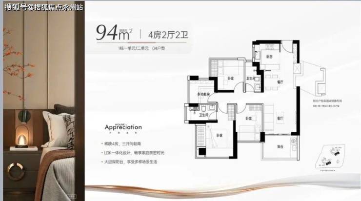 94㎡的4房2厅2卫,设计的是竖厅格局,进门独立玄关,LDKB一体化,S墙设计预留冰箱卡槽位,主卧双飘窗设计,U型厨房,卫生间干湿分离,得房率约97%(包含赠送),东南朝向。