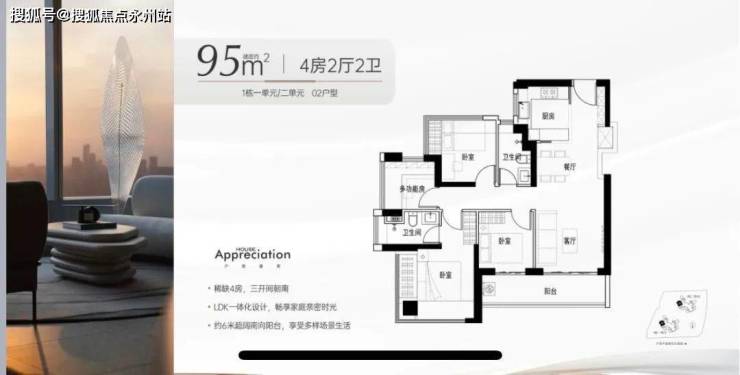 95㎡的4房2厅2卫,设计的是竖厅格局,进门独立玄关,LDKB一体化,S墙设计预留冰箱卡槽位,主卧双飘窗设计,客厅连接次卧出6米长的大阳台,L型厨房,卫生间干湿分离,得房率约97%(包含赠送),西南朝向。