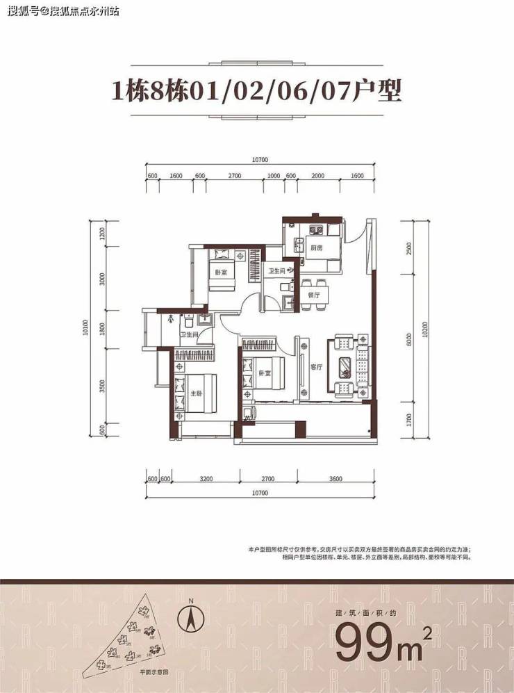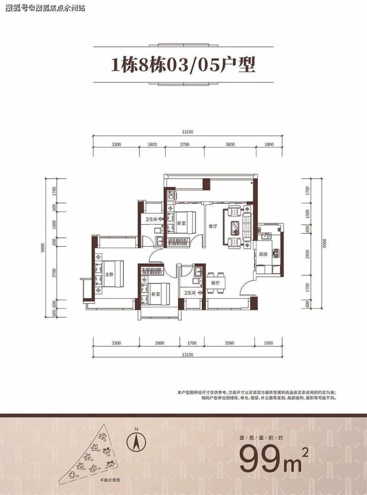 99㎡的3房2厅2卫,1/8栋03/05户型,设计的是竖厅南北通透格局,客厅3.6米开间,LDKB一体化设计,3个卧室分别做到了主卧13.94㎡/次卧9.03㎡/次卧7.9㎡(实测面积,去掉墙体),客厅连接次卧出6.3米长的大阳台,U型厨房,卫生间干湿分离,得房率约93.62%(包含赠送),西北朝向看花园。