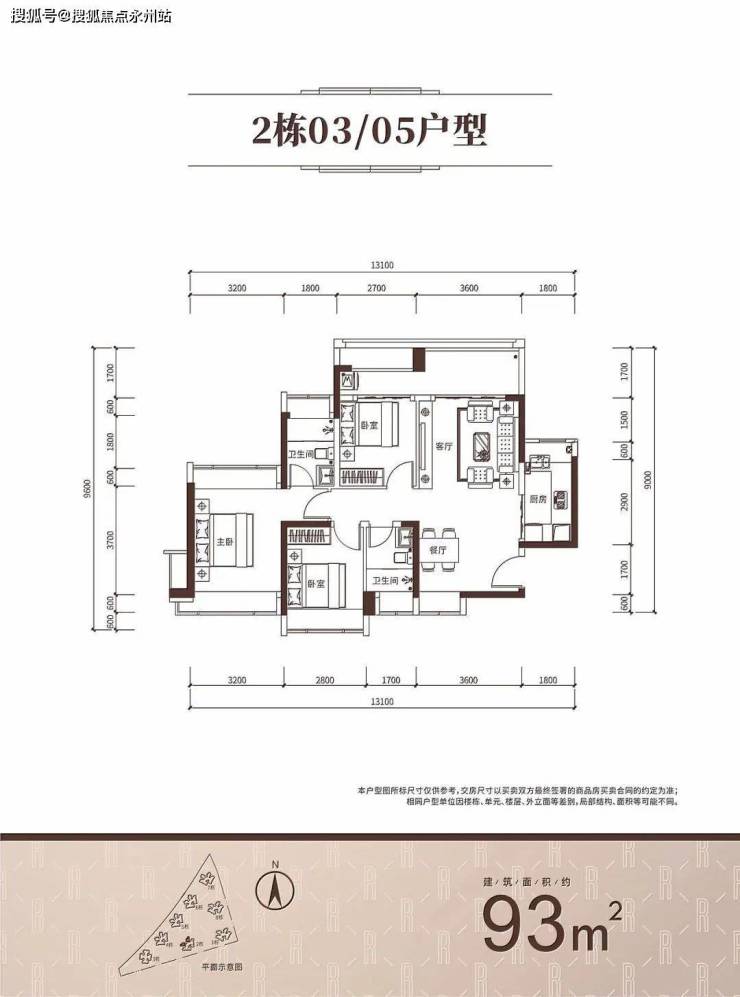 93㎡的3房2厅2卫,2栋03/05户型,设计的是竖厅南北通透格局,客厅3.6米开间,LDKB一体化设计,3个卧室分别做到了主卧13.94㎡/次卧9.03㎡/次卧7.9㎡(实测面积,去掉墙体),客厅连接次卧出6.3米长的大阳台,U型厨房,卫生间干湿分离,得房率约93.62%(包含赠送),西北朝向看花园。