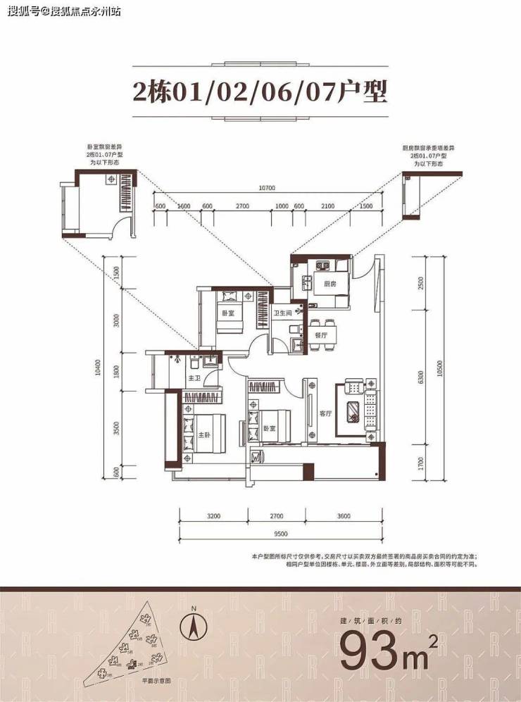 93㎡的3房2厅2卫,2栋01/02/06/07户型,设计的是经典竖厅格局,客厅3.6米开间,LDKB一体化设计,三开间朝南,3个卧室分别做到了主卧13.94㎡/次卧9.22㎡/次卧7.7㎡(实测面积,去掉墙体),客厅连接次卧出6.3米长的大阳台,U型厨房,卫生间干湿分离,得房率约93.62%(包含赠送),西南/东南朝向。