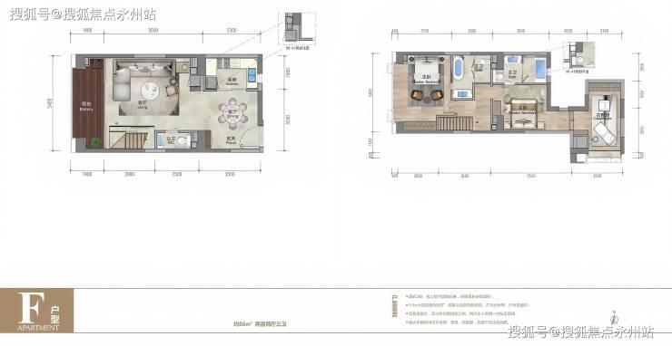 88㎡复式两房两厅三卫 双向通透采光,5.4米开间客厅及主卧,双套房周全设计,室内多变空间可根据家庭需要设置独特的功能。