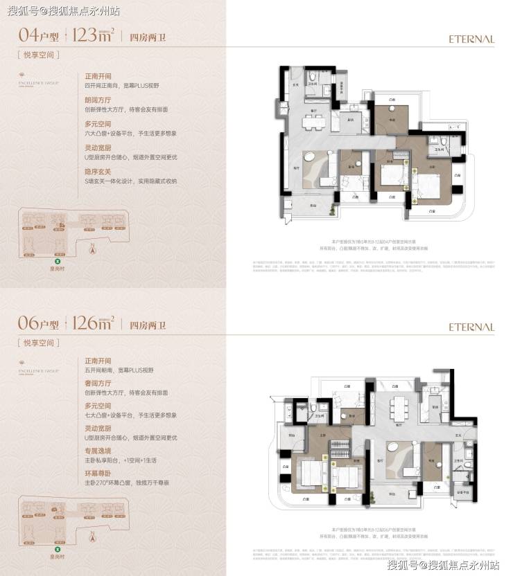 空间尺度:123㎡户型客厅开间4.2米,126㎡户型实现南北通透,主卧均采用270°弧形飘窗,搭配独立卫浴与衣帽间,营造酒店式居住体验。