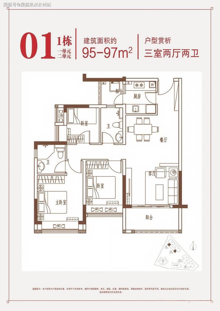 约95-97㎡三房两厅两卫:南向端头位,三面采光,可瞰花园景观,主卧带独立卫生间,总价416-494万。