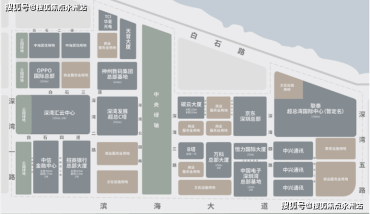 深超总片区现已开工项目16个,深湾汇云中心、神州数码集团总部、天音大厦、中国电子总部主体结构已封顶,中信金融中心、中兴通讯总部、OPPO国际总部、招商银行总部、碳云大厦等项目已进入主体施工阶段。世界500强企业总部争先进驻,是深圳未来最有发展潜力的区域,俨然深圳走向全球城市的名片。