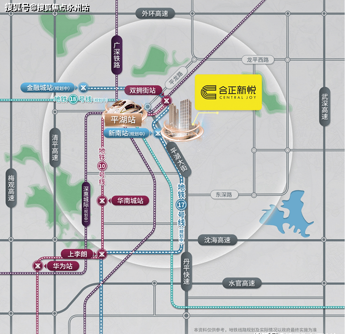 从目前流出的站点图来看,17号线拟在平湖片区设立8大站点(规划中)。其中,在新南站(规划中)的附近,一个综合大城项目未开盘已走红——那就是合正新悦。