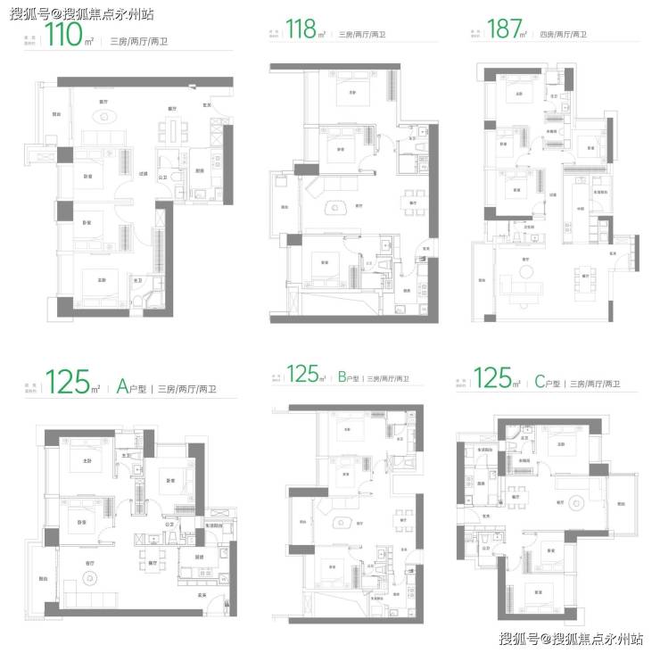 110㎡户型:这种户型通常设计为三房两厅两卫,适合小型家庭或刚需购房者。户型设计注重空间利用和功能性,确保居住舒适。