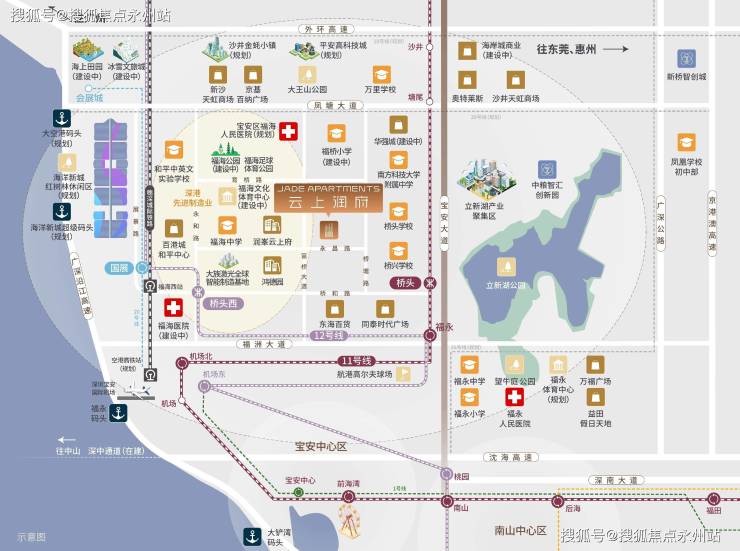周边另规划有20、18、26号线等多条地铁,以及宝安机场、海洋新城超级码头(规划中)、国际邮轮港(规划中),轻松构建覆盖全城,乃至湾区和国际的高效通勤圈。