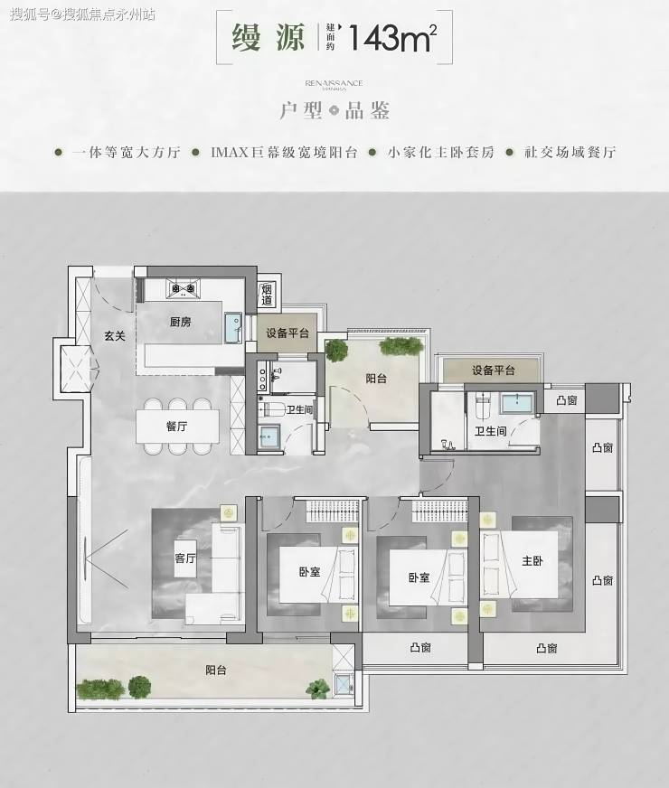 143㎡户型:这种户型应该是东南朝向,阳台+3房间同一朝向,同样阳台可以改房间;