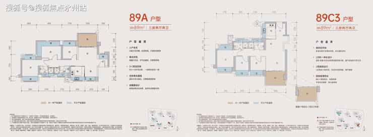建面约89㎡竖厅三房两厅两卫:四开间朝南,LDKB 一体化设计,客厅开间3.5米,可改造设备平台为3+1房,得房率96%-100%。