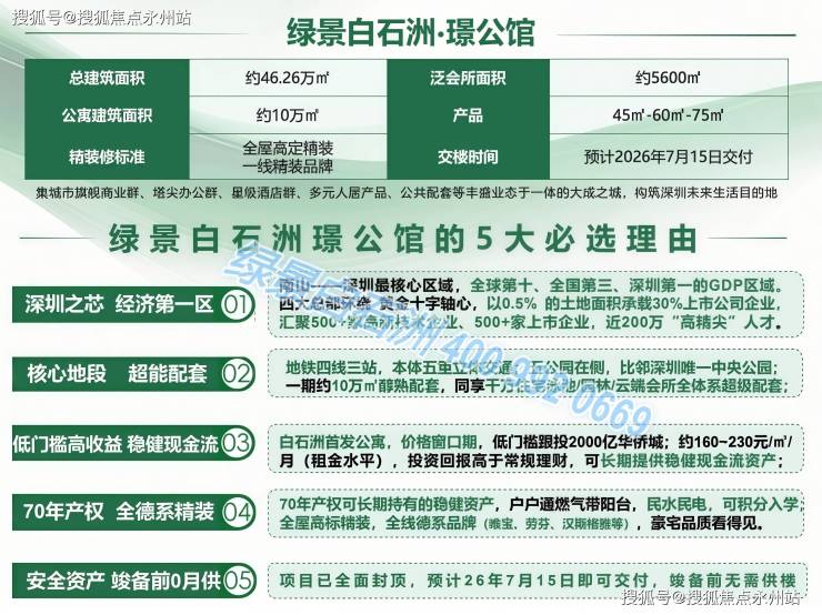 南山绿景白石洲·璟公馆凭借“超级综合体配套+国际品质设计+稀缺资产属性”,成为南山核心区高性价比之选。其园林设计、智能安防、豪装标准均达到区域领先水平。