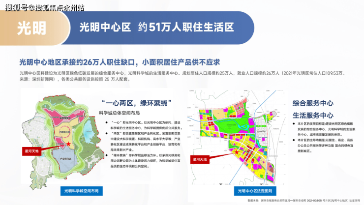 2020年6月9日深圳市规划和自然资源局发布《光明科学城规划刚要》中,规划“一心两区,绿环萦绕”的科学城总体空间布局,以光明中心区为依托,建设科学城的生活服务中心。