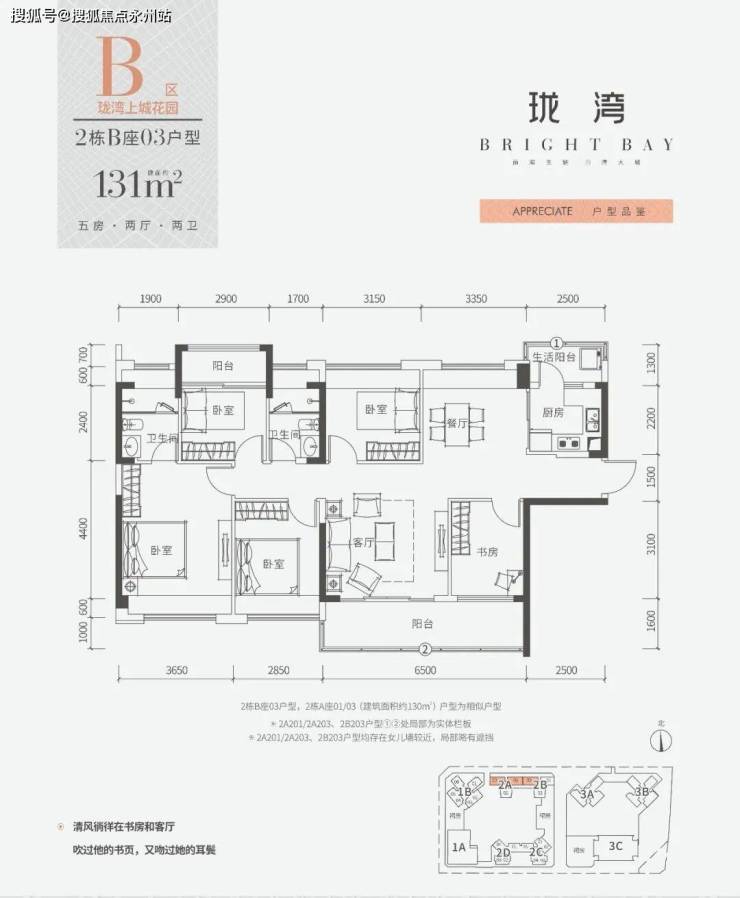 五居室(131㎡):131㎡五房两厅三卫是项目的最大户型,南北通透,三阳台设计,约4米阔景大阳台,属于稀缺产品,主要面向高端改善客群。