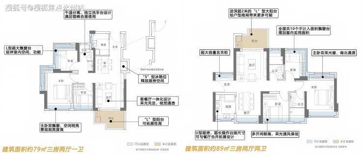 两种户型均通过飘窗(进深0.6-0.9米)、阳台(不计全面积)、设备平台等赠送空间,实际得房率达90%-93%(含赠送),远超市场同类型产品。例如,79㎡户型通过7个飘窗增加约 5㎡使用面积,89㎡户型通过10个飘窗+主卧套房设计,实现空间零浪费。