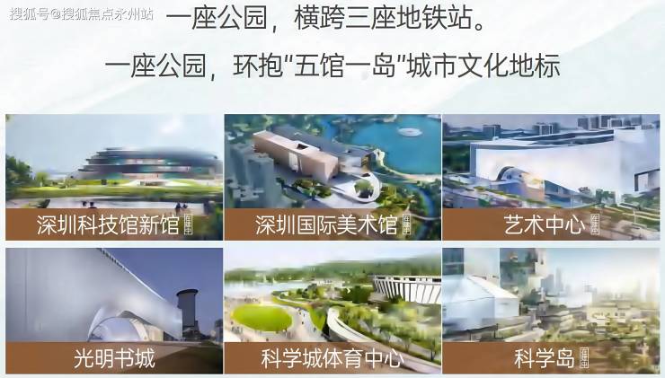 依托科学公园这一城央生态绿地,还分布有深圳科技馆新馆(建设中)、深圳国际美术馆(暂定名,建设中)、艺术中心(建设中)、光明书城、体育馆、科学岛“五馆一岛”城市级文化地标,便捷畅达,轻松享受休闲时光。