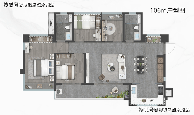 御景:建面约106㎡,四室两厅2卫,约13.7米5面宽,IMAX级宽奢采光
