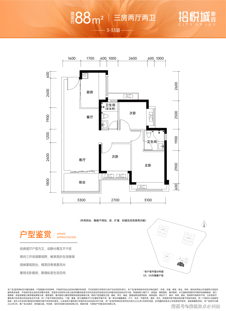88㎡三房两卫定位稍高,总价325万-335万,主要差异在于多了一个卫生间,更适合改善型家庭需求。