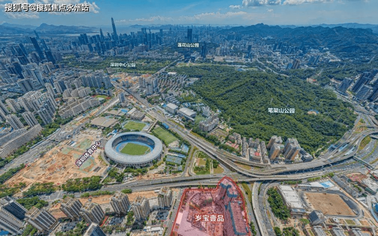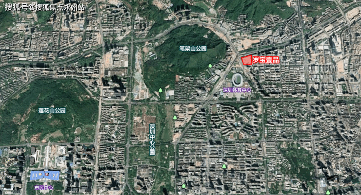 ③俯瞰双山:北侧靠福田“大靠山”塘朗山山脉的银湖山,西侧靠近笔架山公园、深圳市体育中心以及南北贯穿福田的环中心公园