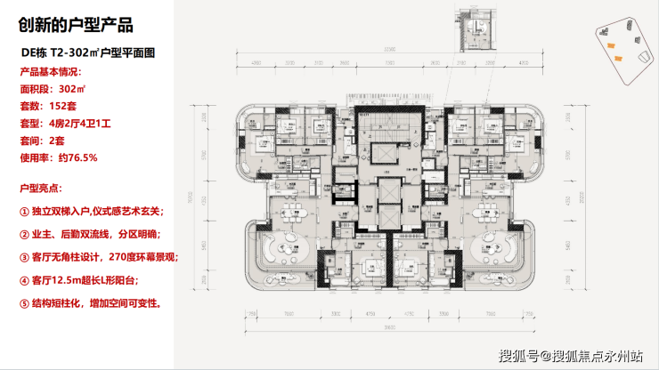 302㎡四房四卫+家政套间:分布在D栋和E栋,3梯2户都有双门梯专梯入户,每层层高3.5米,01和02户主要是因为核心筒的结构影响了家政套间和生活阳台的差异,区别并不大。