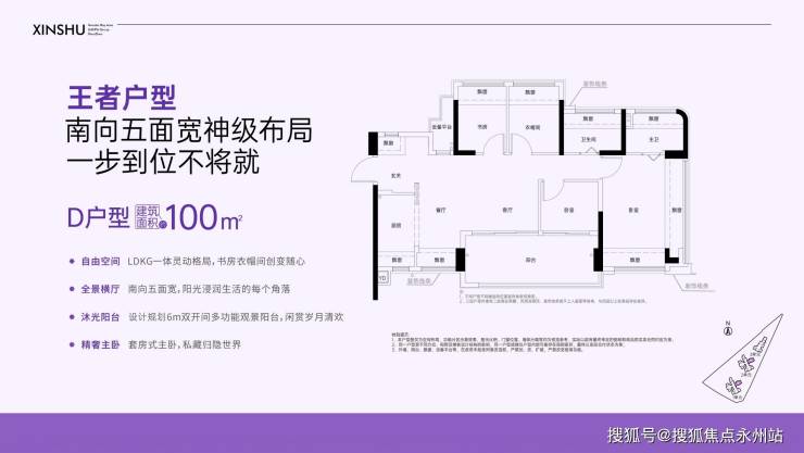 约99-100㎡的4房2厅2卫,设计的是横厅南北通透格局,独门独户还有私用公区,客餐厅5.35米开间,LDKG一体化灵动设计,做到了主卧双飘窗,五开间朝南,动静分区,U型大厨房,厨房烟道还做了外置空间,可以更好的利用厨房空间,卫生间干湿分离。赠送了阳台一半面积+9面飘窗+1个设备平台,超100%得房率,长约6米的大阳台主朝东南向。这是红山板块同面积段仅有的户型格局,整个红山只有46套。