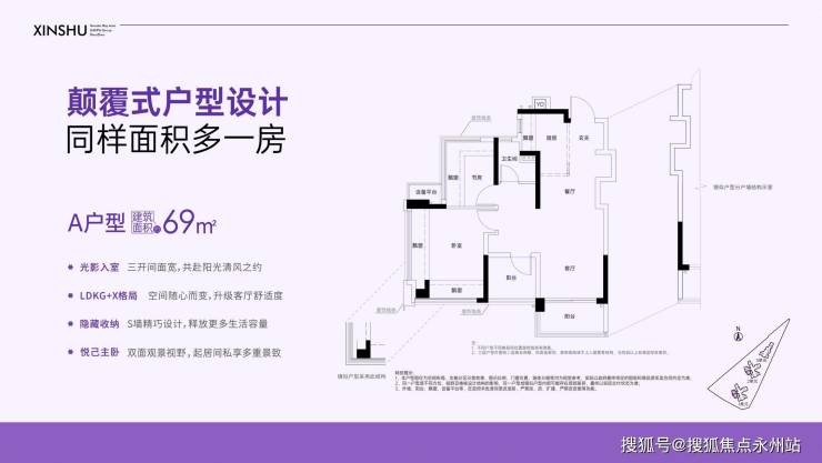 约69㎡的2+1房2厅1卫,设计的是竖厅LDKG+X格局,客厅3米开间,S墙设计预留冰箱卡槽位,做到了主卧双飘窗,三开间朝南,动静分区,U型大厨房,厨房烟道还做了外置空间,可以更好的利用厨房空间,卫生间三段式干湿分离。赠送了双阳台一半面积+5面飘窗+1个设备平台,超100%得房率,西南朝向。这是整个红山板块上车门槛最低的3房。
