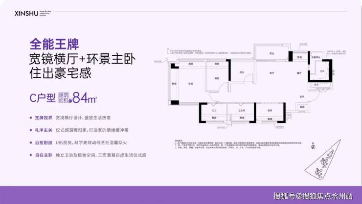 约84㎡的2+1房2厅2卫,设计的是横厅南北通透格局,客餐厅5.3米开间,独门独户还有私用公区,客餐厅一体化设计,做到了主卧双飘窗,动静分区,U型大厨房,厨房烟道还做了外置空间,可以更好的利用厨房空间,卫生间干湿分离。赠送了双阳台一半面积+8面飘窗+1个设备平台,超100%得房率,阳台主朝东北向。