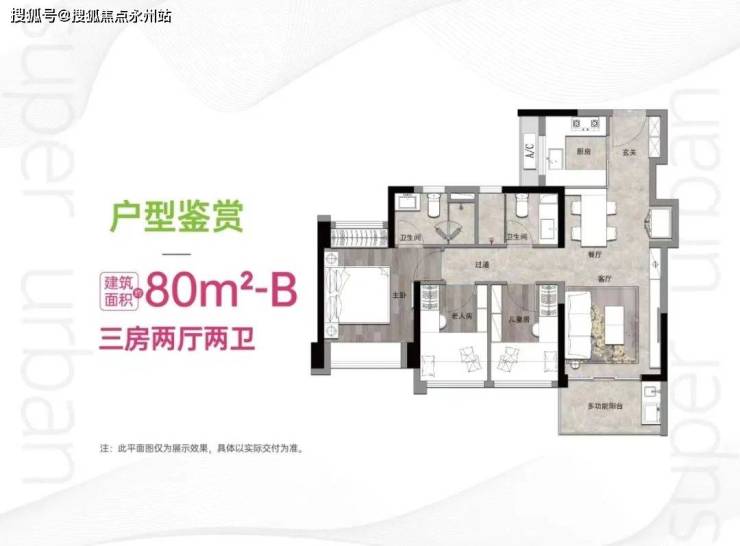 建面80平米:3房2厅2卫,传统的竖厅户型,动静分区的格局,不包括赠送的情况下得房率在80%以上;三个房间和客厅属于同一个朝向,这种户型在采光方面是最优秀的,特别是东南和西南朝向,当然,这种设计导致走道过长,有比较大的面积让费;80平米3房2卫,户型整体很紧凑,各个功能间勉强够用,能有这样的设计属实不易。