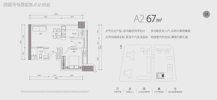 (公寓)推售约67-87㎡1-2房,均位于29层之上高区,享百米以上景观。70年产权,户户带阳台,拥有3.3m超舒适层高。室内公区、样板房均由CCD香港郑中设计事务所设计,将高级定制融入每一寸居住空间