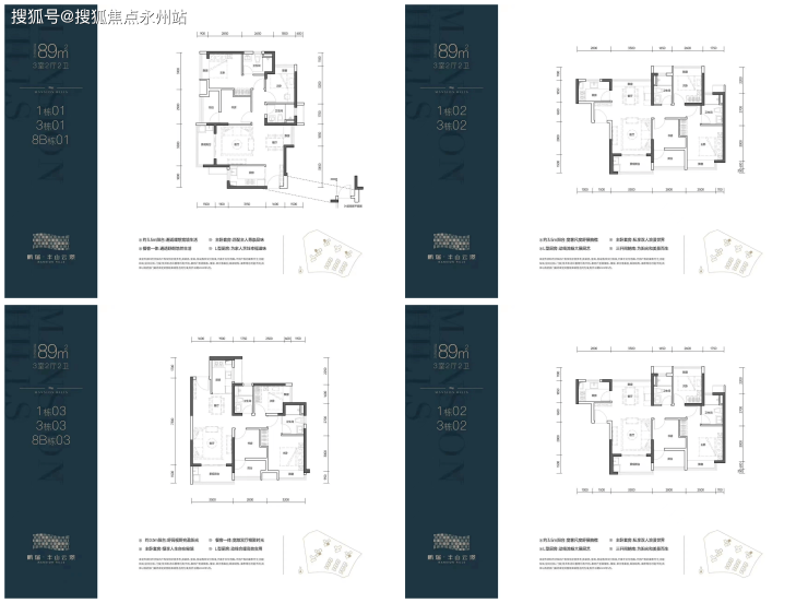 01户型:89㎡的3房2卫,设计的南北通透竖厅格局,客厅3.5米开间,三开间朝南,L型厨房,3个卧室做到了2.9/3.2/3.1米的宽度,阳台主朝西南向。