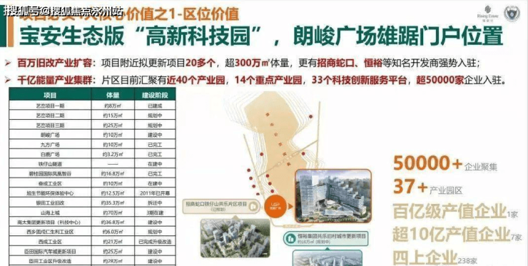 2、宝安生态版“高新科技园”,朗峻广场雄踞门户位置百万旧改产业扩容:项目附近拟更新项目20多个,超300万㎡体量,更有招商蛇口、恒裕等知名开发商强势入驻。